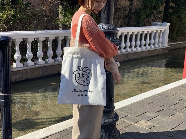 その名の通り巾着のように上部が絞れるトートバックです♡肩ひもが長めなので持ちやすく、紐部分のハートがさりげなく可愛い。そんなトートバックです。