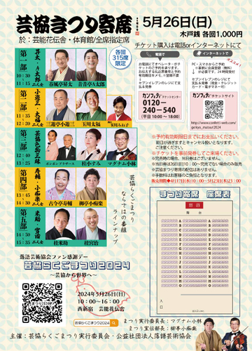 芸協らくごまつり実行委員会/公益財団法人落語芸術協会/(株)オフィスタックル主催、芸協らくごまつり2024『芸協まつり寄席』が2024年5月26日(日)に芸能花伝舎・体育館(東京都新宿区西新宿6-12-30 芸能花伝舎 A棟2F)にて開催されます。