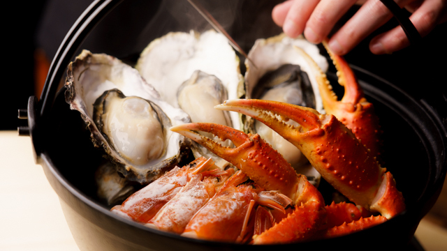 蓋を開けた瞬間に立ち上る牡蠣の磯の香りが食欲をそそり、鮮やかな紅色のズワイガニがテーブルを彩ります。