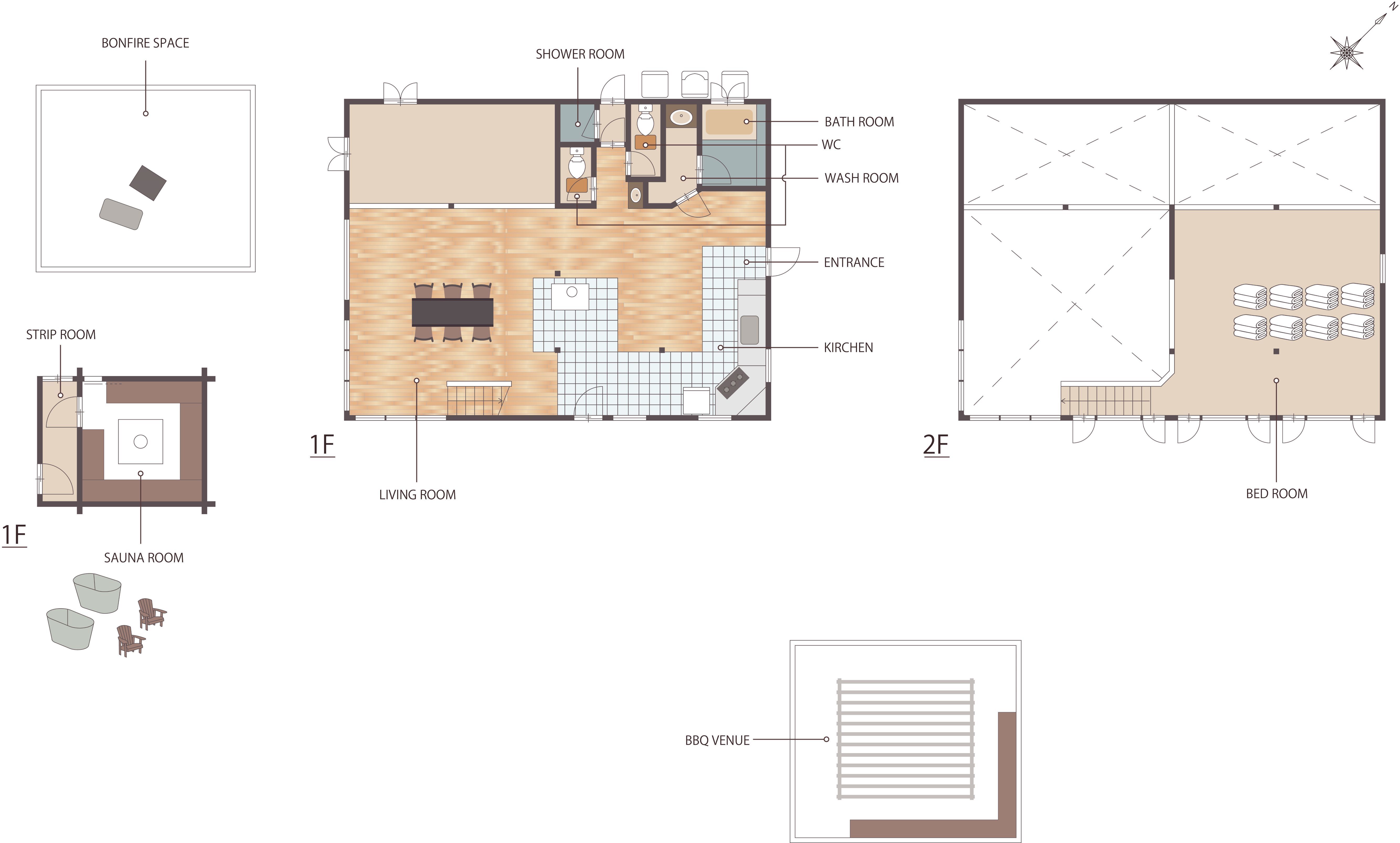 全施設に薪サウナ、焚火台、華やぐBBQは屋根付きスペースを完備。天気を気にせずご予約が可能です。身体を温め、自然の風を感じ、夜空を見上げながら「ととのい時間」をご堪能ください。