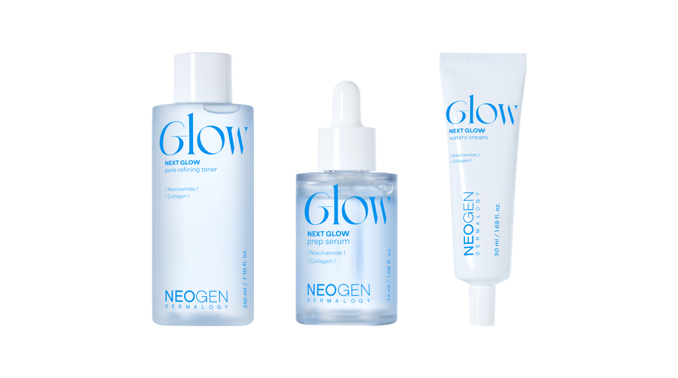 「NEXT GLOW」ラインは、純度99%のナイアシンアミドを配合したトナー・セラム・クリームの3ステップで、メイク前に使うことで水分バランスを整え、ベースメイクの仕上がりを格上げできるのが特徴です。うるおいをしっかり与えながらも肌表面をなめらかに整えるため、ファンデーションの密着感や持続力をサポートします。