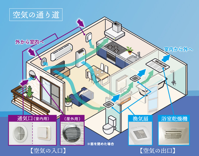 建築基準法改正によって24時間換気システムが義務化されたため、 2003年7月以降に建てられた建造物は、窓を閉めていても、通気口から強制的に外気を取り込み、 換気扇から排出し換気される仕組みになっています。