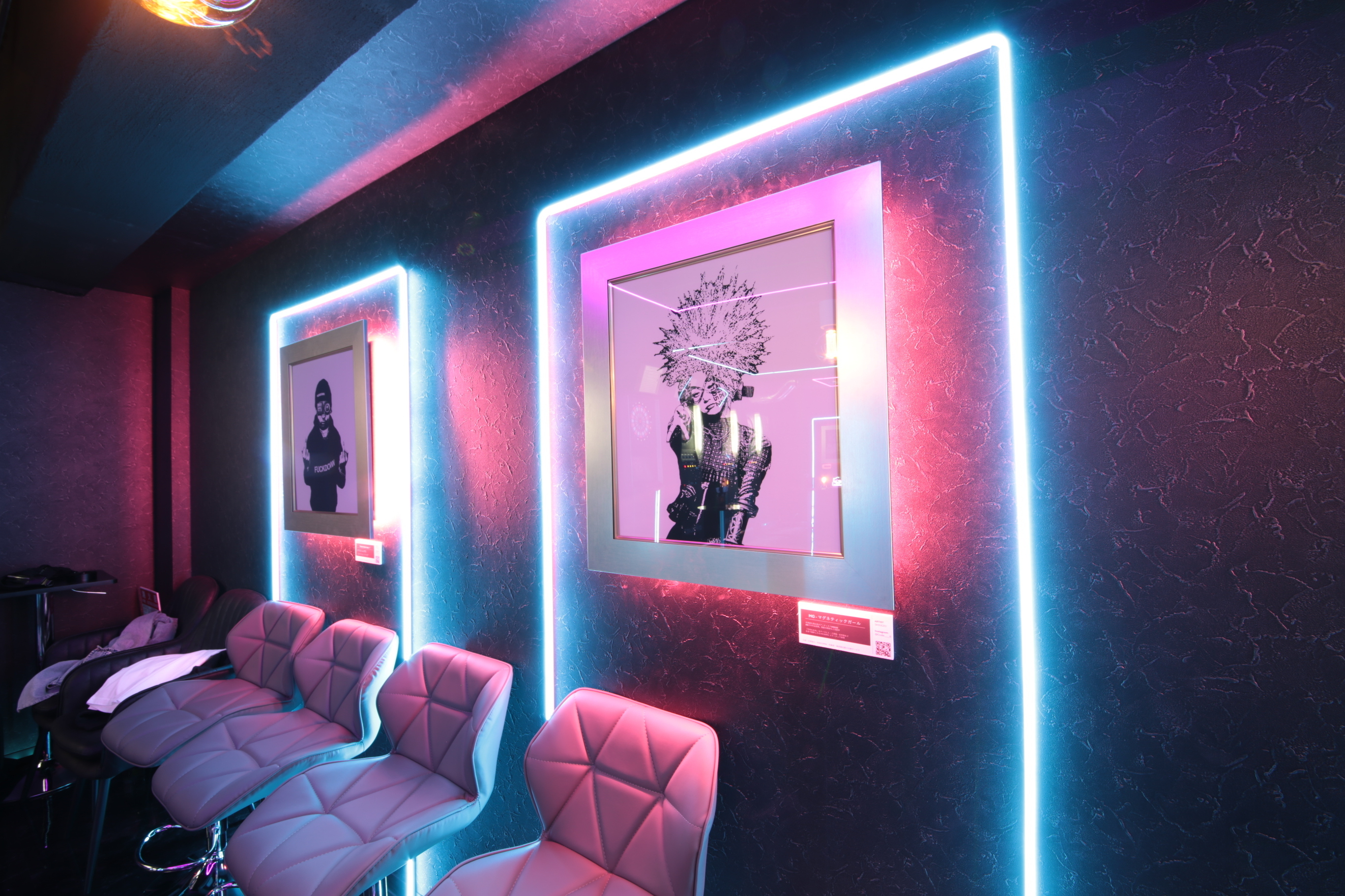 アーティストとのコラボ企画で制作されたアートも当店の雰囲気を盛り上げてくれるこだわりポイントです。ゆったり過ごせるソファー席も完備しており、非日常空間ながらも居心地の良い空間に仕上げました。