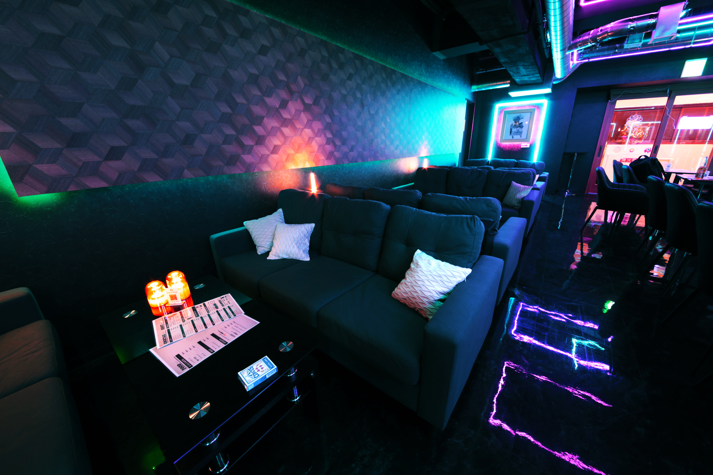 日常から離れた時間をお楽しみいただくため、内装デザインにもこだわっています。ネオンの装飾を施した店内は非日常を楽しめる空間となっております。