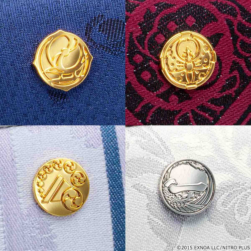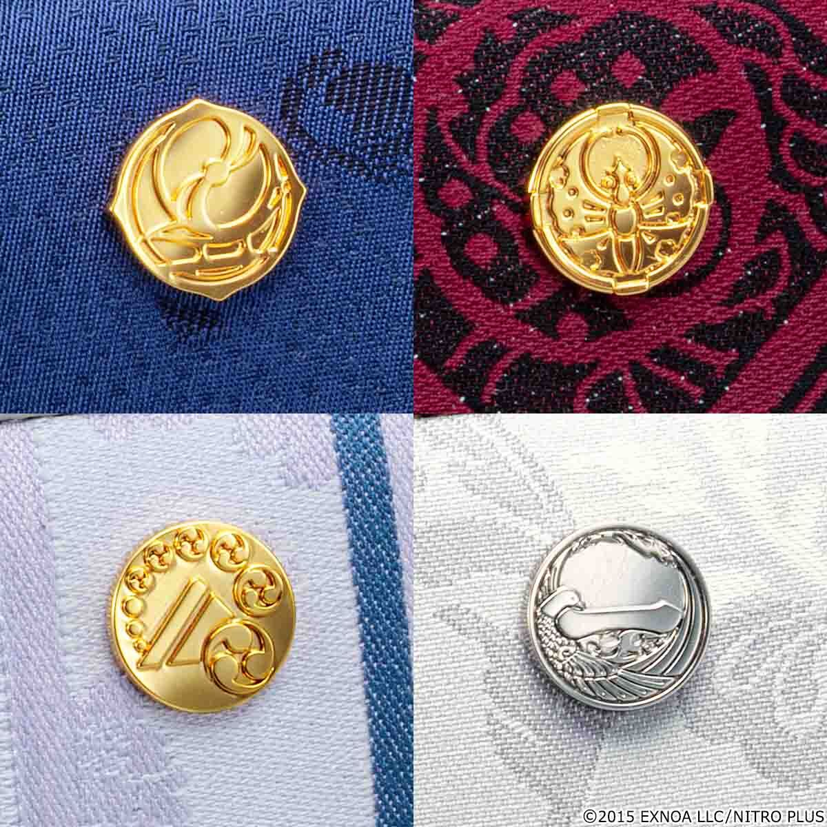 表面にはそれぞれの刀剣男士紋が刻まれた飾りボタンがあしらわれ、意匠に華を添えています。