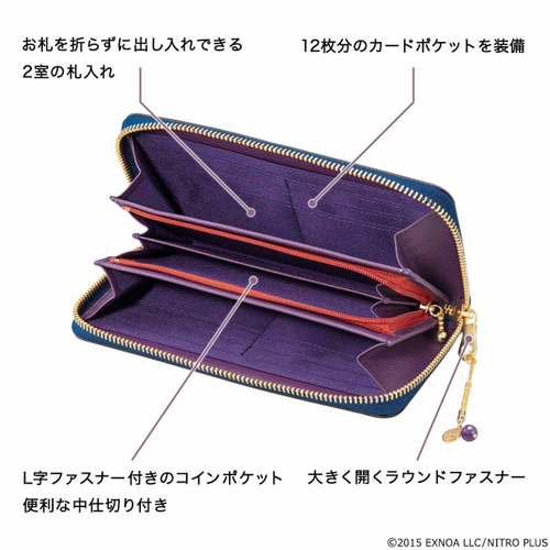 財布にはそれぞれの刀剣男士紋が刻まれた飾りボタンがあしらわれ、イメージカラーの天然石と刀剣男士紋のチャームが付属。