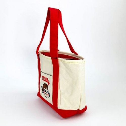 ノーマルなキャンバス地のミニトートは、デイリーにもお出かけのサブバッグにも大活躍。カラーも赤、ネイビー、ベージュの3色で、ペコちゃんの刺繍にメロメロです。