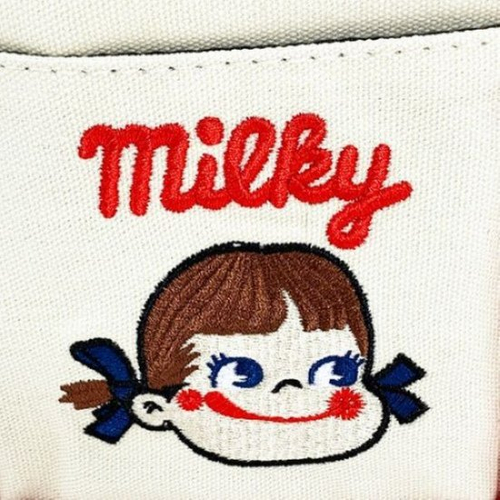 ポケットの部分には、ペコちゃんのお顔とmilkyのロゴが刺繍されています。