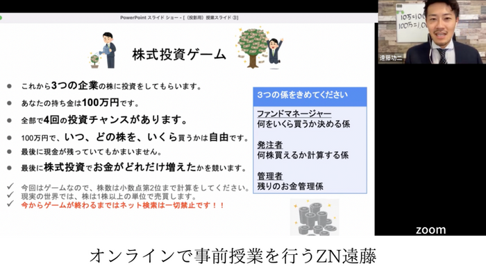 そこで、生徒たちの基礎知識を固めるために、事前授業を行うことになった。講師はZN代表の遠藤だ。証券会社、銀行を経て2020年4月に、FPとして独立している。専門は金融教育だ。「知識がないために損をする人」をたくさん見たことで、教育に興味をもった。「金融業界は、知識が損得を左右する。特に投資の知識は家庭環境による個々の格差が大きい。全国の学生に平等に投資の知識を届けたい。」と語る。