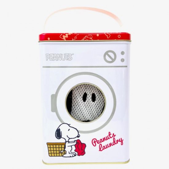 チャーリーブラウンの洋服型ネットが入ったスヌーピーお洗濯2点セット♪洗濯機の窓からのぞくお顔にくぎ付けの缶入りが嬉しい!正直可愛すぎて私が欲しいって感じ。。。
