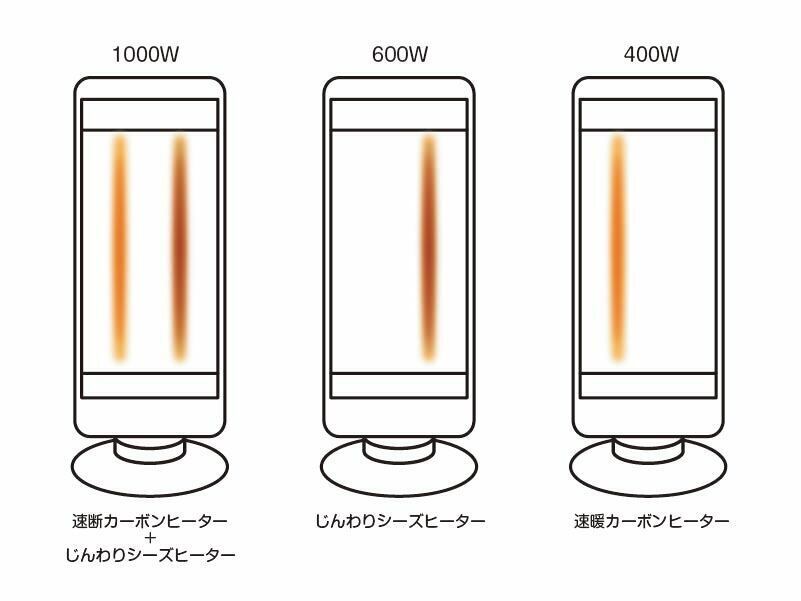 本製品は、電源を入れるとすぐに暖かくなる「速暖」タイプのカーボンヒーターと、赤外線の放出量が多く「体の芯まで暖かさが届く」シーズヒーターを組み合わせて3段階の暖め方ができ、管の背面にある熱反射板が熱を効率よく拡散します。