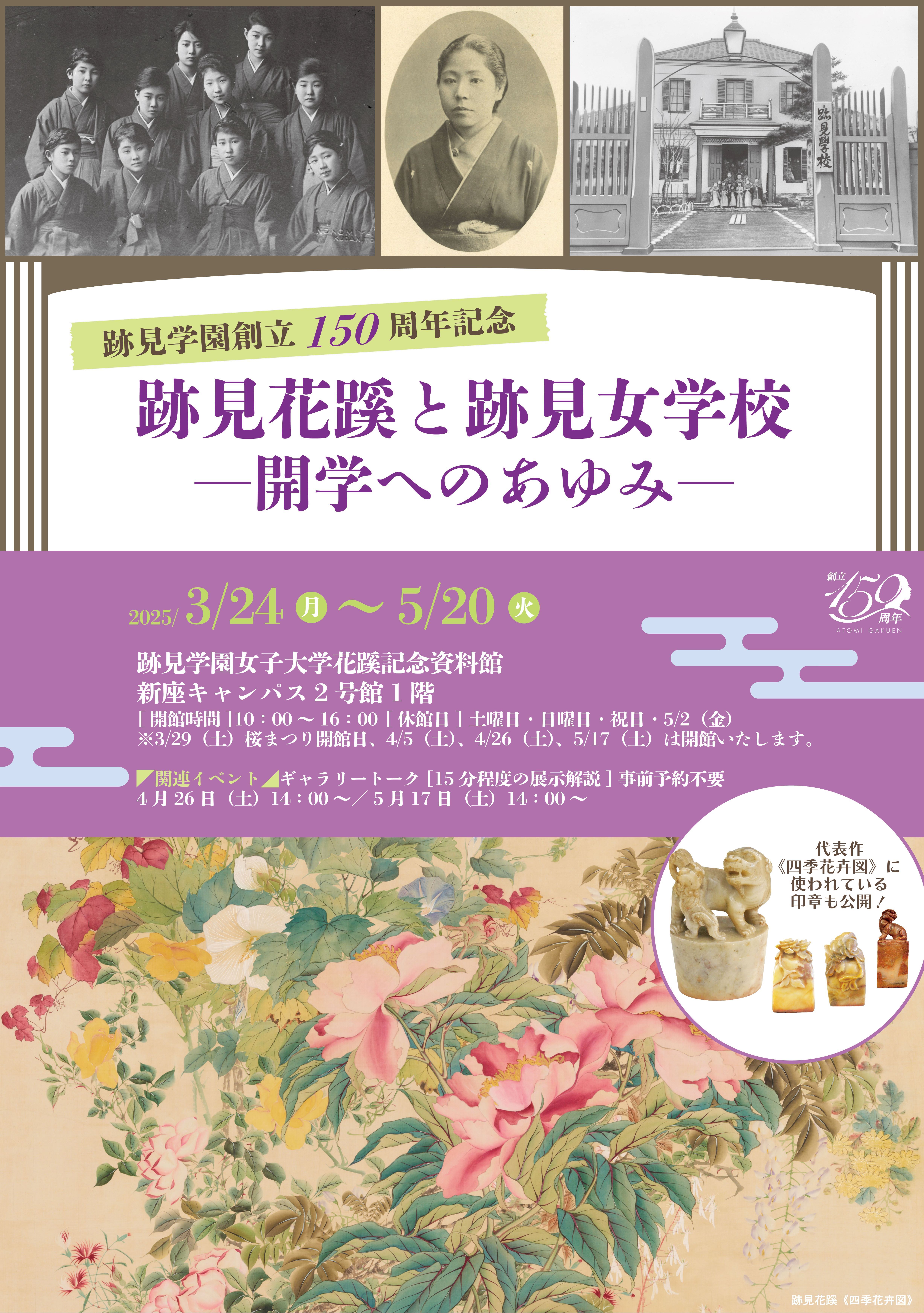 本展では、洋画家・黒田清輝による花蹊の肖像画を公開します。また、書画のみならず、花蹊が実際に着用していた「紫袴」や、生徒に授けた書画の手本、代表作《四季花卉図》に使用されている印章も展示いたします。花蹊はいかにして開学への道のりを歩んだのか、豊かな創作活動の足跡をお楽しみいただければ幸いです。