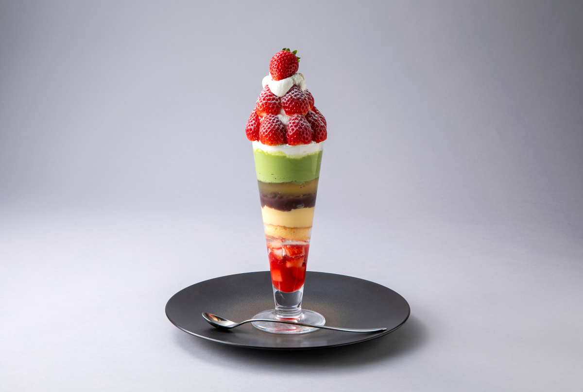 抹茶クリームや抹茶ガナッシュ、お抹茶のパウダーと三様の抹茶の層に、完熟いちごなどを重ねて、八層のパフェにしました。一口食べれば奥深い抹茶の風味と、栃木の恵みが口いっぱいに広がります。さらに抹茶パフェに自社農園で採れる完熟いちごをたっぷりトッピング!抹茶の深い香りとコクに、フレッシュでみずみずしいいちご本来の甘酸っぱさが重なり、より華やかな味わいをお楽しみいただけます。