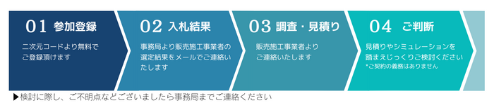 共同購入事業では、”品質”と”価格競争力” を担保するために販売施工事業者の事前審査と入札を実施しています。優良かつ価格競争力のある販売施工事業者のみが本事業に参加できるようにするため、事前審査では、販売施工事業者は施工実績や施工・メンテナンス体制、財務状況などの観点で厳しくチェックをされます。入札では、事前審査に通過した販売施工事業者の中で、最も安い価格を提示した販売施工事業者が選ばれます。