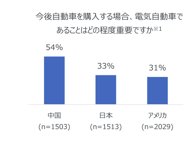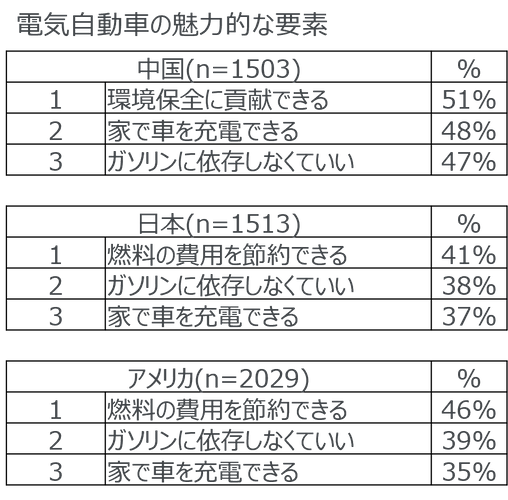 中国の回答者の54% ※1が、今後自動車を購入する場合、電気自動車であることを重視すると回答。これは日本やアメリカの結果よりもかなり高い結果であった。また、電気自動車の魅力的な要素として、中国回答者の51%が「環境保全に貢献できる」と回答。一方、日本やアメリカでは、「燃料費用を節約できる」と回答した人が最も多かった。