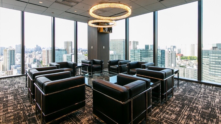 高層階ならではの眺望と開放感が魅力の応接スペースで、壁一面の大きなガラス窓から都会の街並みを一望できます。黒を基調とした革張りソファとガラス製テーブルが配置され、モダンで高級感のある雰囲気を演出。円形のシャンデリア風照明が華やかさを添えています。商談や来客対応に適したレイアウトで、お客様を迎える場として最適な空間です。