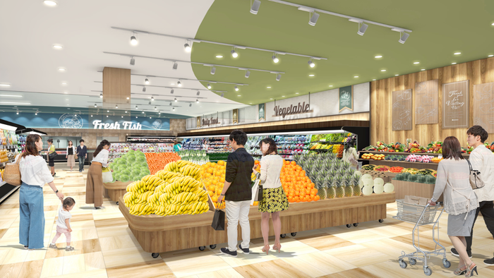 リニューアルオープン後は、新たに屋上駐車場を設けるほか、フルセルフレジを導入しスピーディーなお買物に対応するなど、お客様の利便性を高めるとともに、床・壁・天井などの内装を明るく親しみやすいデザインにいたしました。