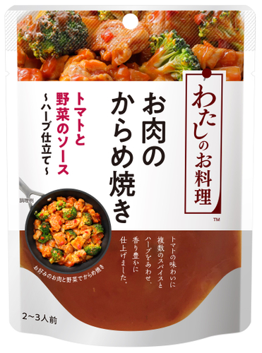 新発売する「わたしのお料理」シリーズの「お肉のからめ焼き」は、「和風たまねぎのたれ~黒酢仕立て~」、「トマトと野菜のソース~ハーブ仕立て~」、「ドミグラスソース~赤ワイン仕立て~」の3品です。肉と野菜をフライパンで炒めて、ソースをからませるだけでメインのおかずができあがります。業務用商品の開発で培った技術を生かし、家庭では作るのが難しい奥深い味わいのソースで、さまざまな肉に合う仕立てです。家で手軽に本格的な味が楽しめる和風と洋風のソースをラインアップしました。2~3人前で使い切りです。