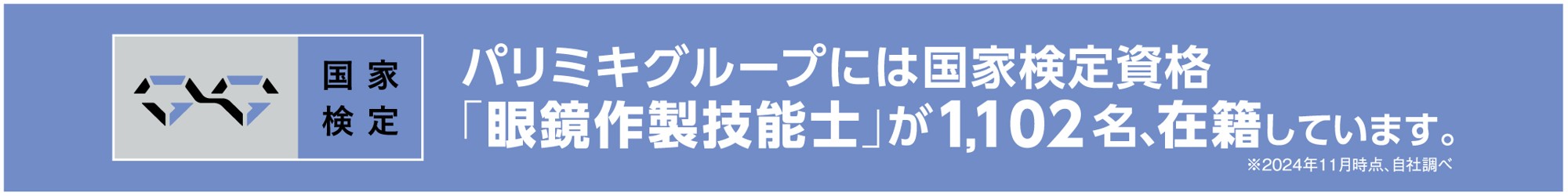 2022年4月より、国の定める「技能検定」の職種に「眼鏡作製職種」が新設され、国家検定資格「眼鏡作製技能士」がスタートし、パリミキグループでは現在1,102 名の合格者が在籍しています(※2024年11月時点) 多様化・高度化するお客様のニーズにあわせて、「適切な診断・治療」と「適切な眼鏡作製」の双方の実現に向け、眼鏡技術者が眼科専門医と連携しつつ、皆様により良い眼鏡を提供し、目の健康を守れるよう、眼鏡作製の技能を高めてまいります。