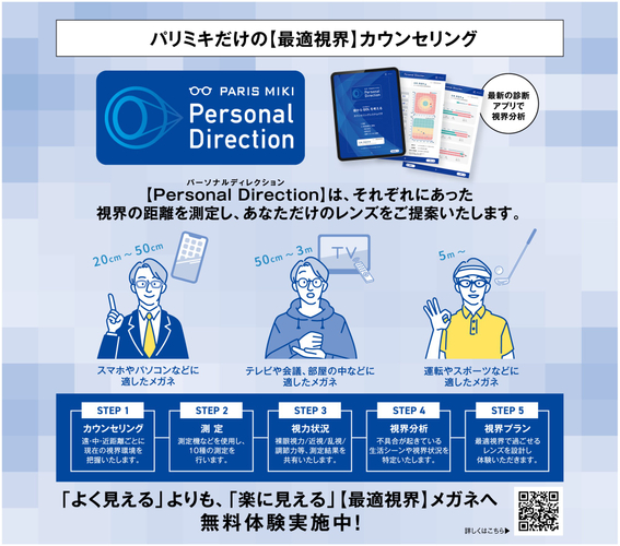 ・「Personal Direction(最適視界カウンセリング)」:国家検定資格「眼鏡作製技能士」保有者をはじめ知識、技術の高いスタッフが、お客様の生活シーンに合わせてストレスのない最適視界をご提案