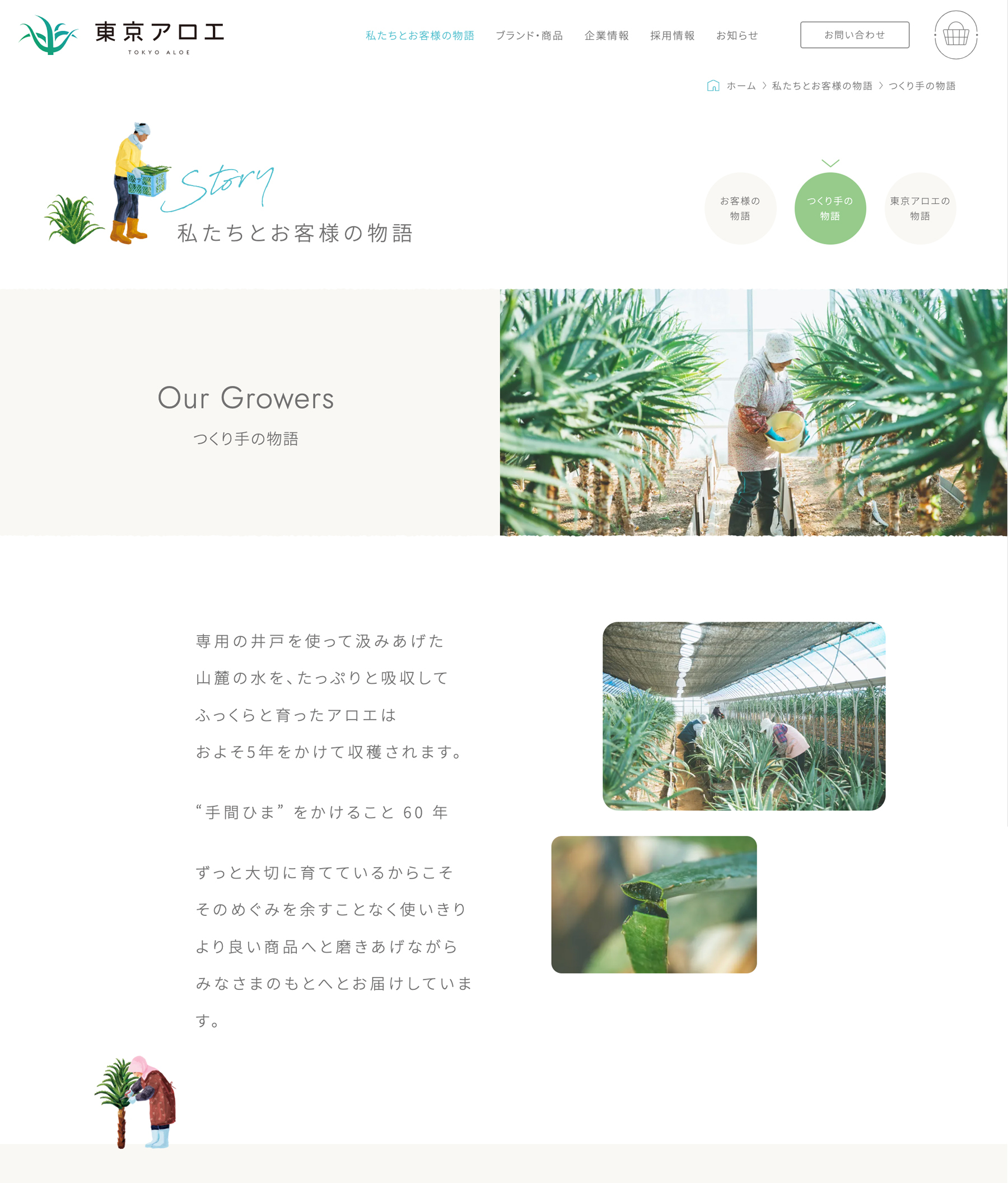 陽射しをたっぷり浴びて、ゆったりと葉を広げるアロエ農園のアニメーションがサイトを訪れた方を出迎えます。農園を散歩しながら、東京アロエの世界観を楽しんでいただけるようなサイトを目指しました。