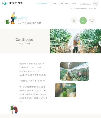60年の月日に詰まったお客様との大切な出会いの数々や、自社農園の有機栽培のこだわり、アロエの不思議な魅力に心奪われ、その普及に生涯を捧げてきた創業者・芦川 良江と東京アロエの60年の物語を丁寧にご紹介しています。