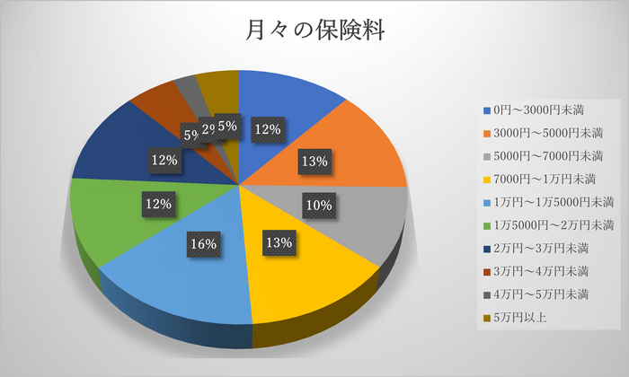 保険加入者に関して、月々の保険料の支払い約半数が1万円未満、3000円未満におさえている層も12%います。