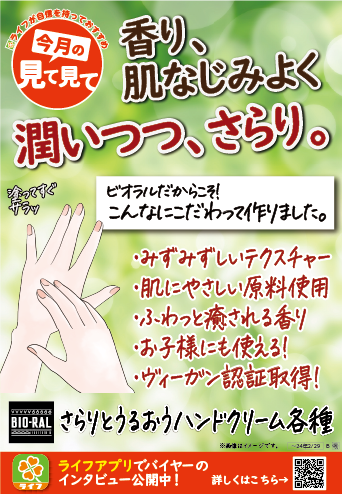 “おいしい” “ワクワク” “ハッピー” をお届けするライフコーポレーションは、身体に優しい素材や製法、健康や自然志向にあわせたプライベートブランド「BIO-RAL」より、「さらりとうるおうハンドクリーム」を1月21日(日)に新発売いたしました。