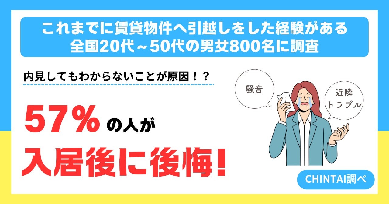 お部屋探しのリーディングカンパニー株式会社CHINTAI(本社:東京都港区 代表取締役社長 奥田倫也 以下CHINTAI)は、これまでに賃貸物件へ引越しをした経験がある全国の20代から50代の男女を対象に、引越し後の物件に対する後悔や早期退去の経験、内見で確認するお部屋の情報についてのアンケート調査を実施しました。