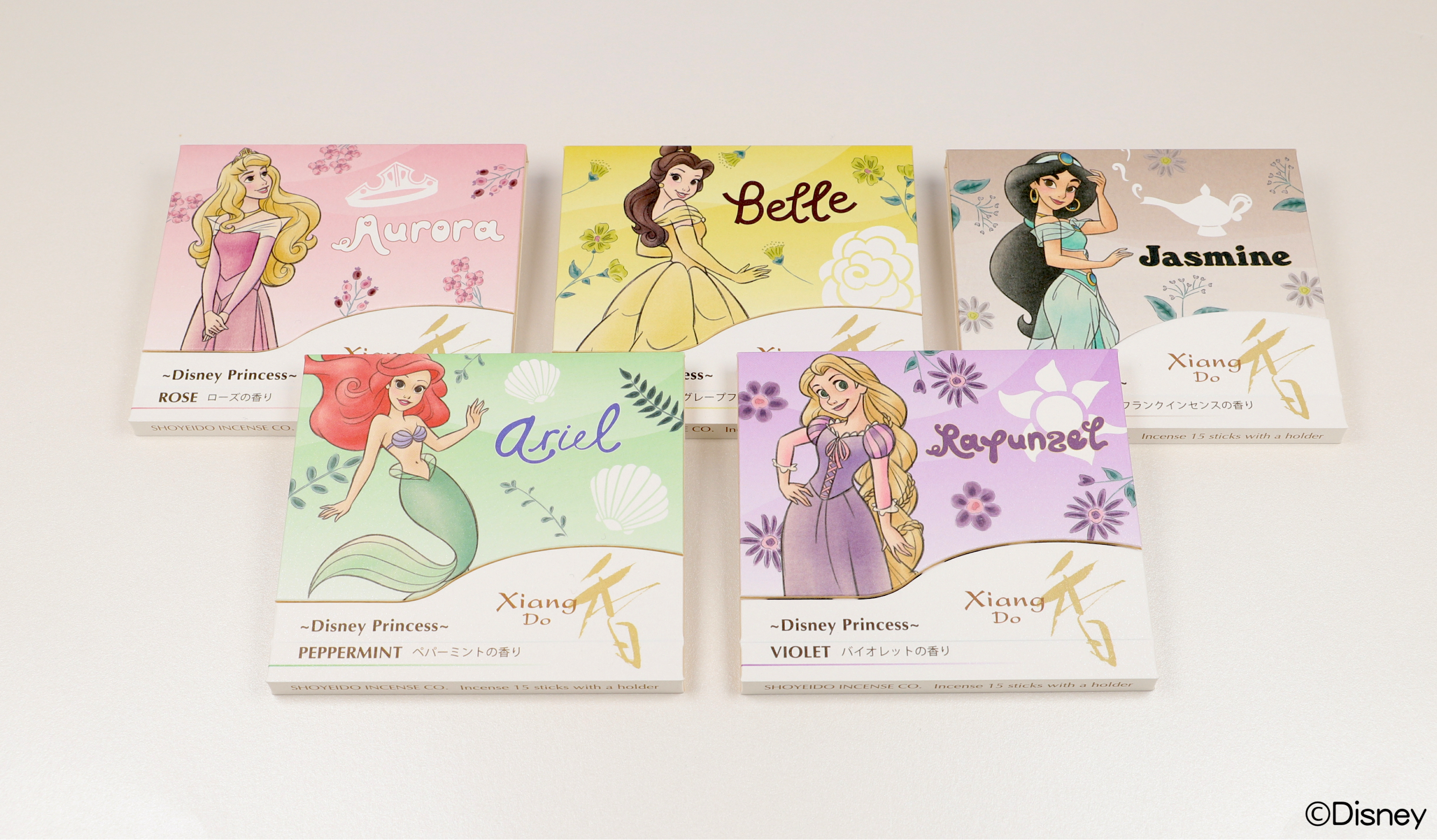株式会社 松栄堂もこのシリーズに参画しており、シンプルな香りの楽しさを提案するXiang Doシリーズから、5人のディズニープリンセスのイメージに合わせてセレクトした香りをオリジナルのパッケージで発売いたします。