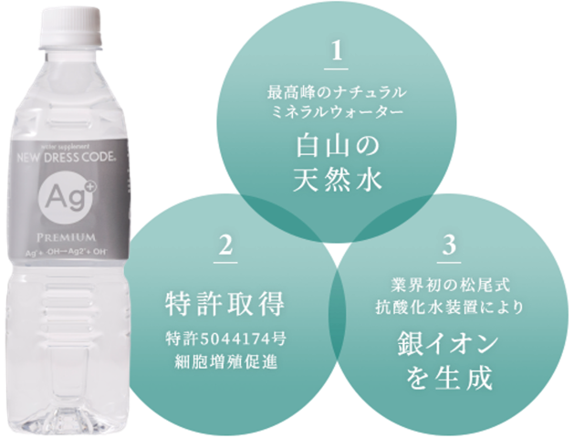 『NEW DRESS CODE PREMIUM』は、日本三大霊山の白山の天然水を特許取得済み(特許5044174号)の活性装置でろ過し、さらに松尾式抗酸化装置を使用して銀イオン(Ag+)を溶解させた、pH8~9のアルカリ性飲料水です。この技術により、水のクラスターが小さくなり細胞の隅々にまで浸透しやすくなります。