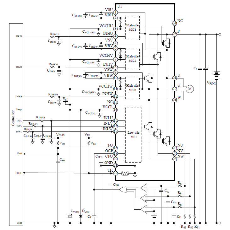 SAM2シリーズは、出力スイッチング素子、プリドライバ、制限抵抗付きブートストラップダイオード、サーミスタなど、3相モータを制御するために必要なデバイスを集約したオールインワンタイプの製品です。