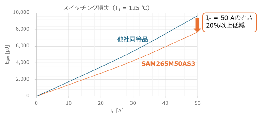 他社同等品と比較すると、スイッチング損失を20%以上低減しました*(条件:TJ = 125 ℃、IC = 50 A)。