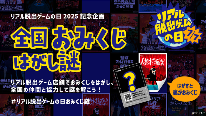 全世界で累計1,490万人以上を動員しているリアル脱出ゲームを企画制作する株式会社SCRAP(本社:東京都渋谷区、代表:加藤隆生)は、7月7日の「リアル脱出ゲームの日」を記念したさまざまな企画を実施し、本日7月1日(火)より、最大3,000円割引になるお得なクーポン情報を掲載したイベントラインナップ特別号の配布、抽選で7名様に高級国産鰻が当たるSNS投稿キャンペーン、大規模謎解き企画「全国おみくじはがし謎」を開催いたします。