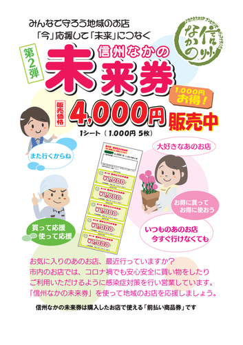 コロナ禍で最近行けていない、お気に入りのお店はありませんか?中野市内のお店では、4000円のお支払いで5000円分のお買い物ができる、お得な応援商品券を購入できます。