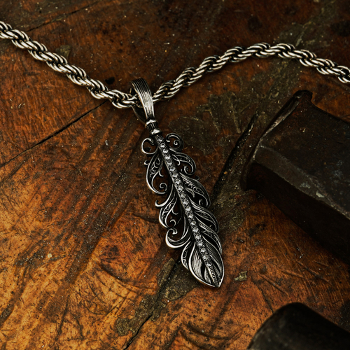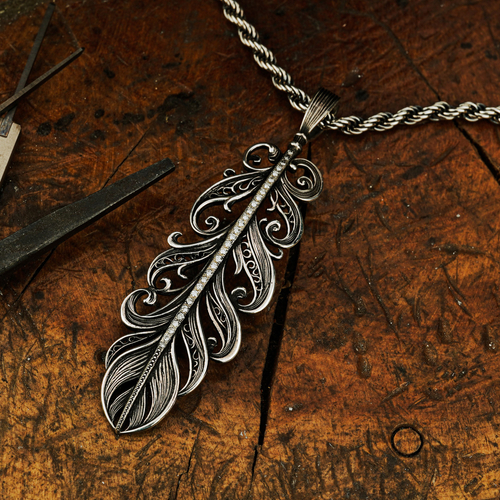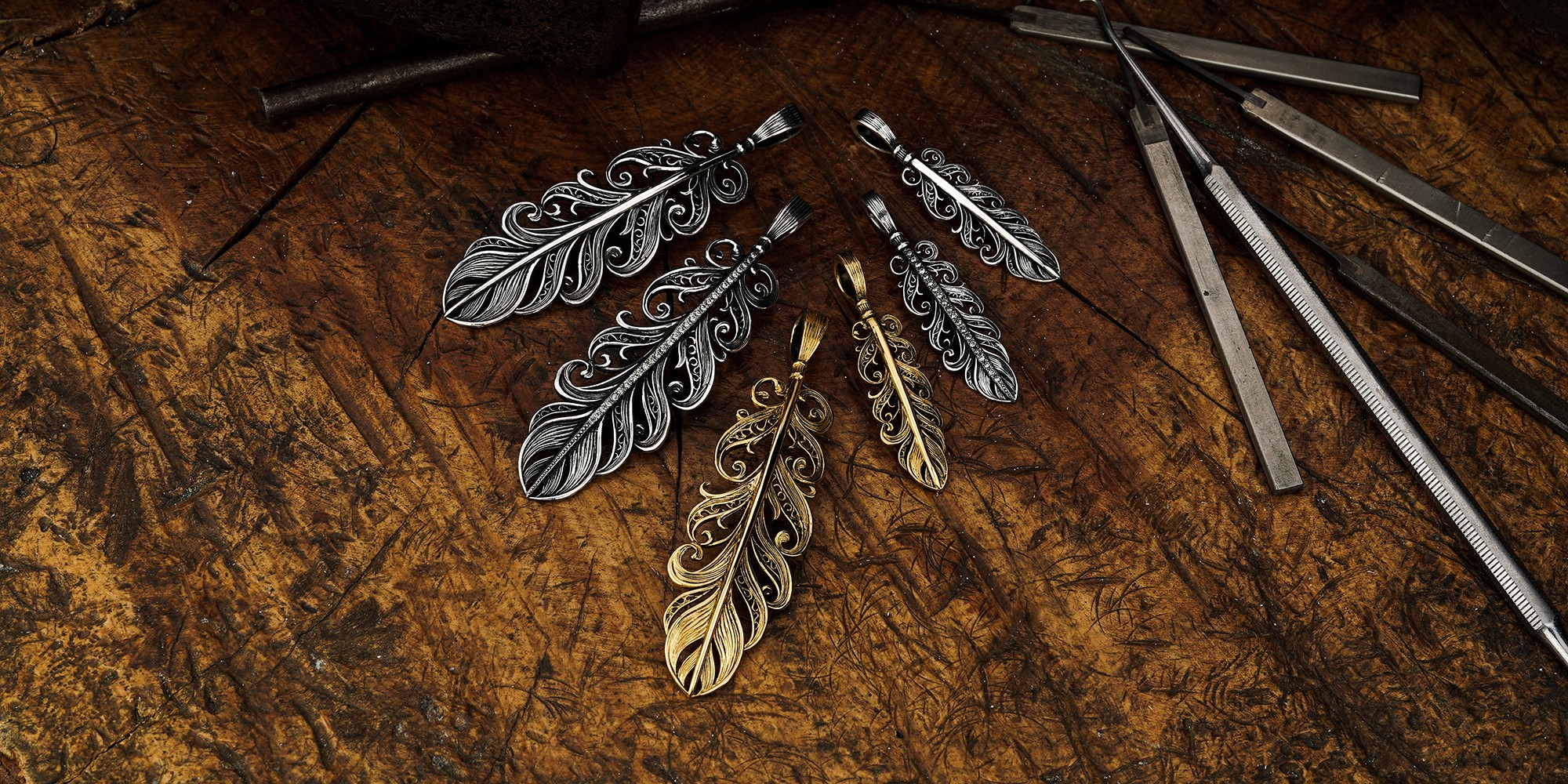 羽根を透かし彫りのシルエットを用いて表現。中世ヨーロッパの装飾を想わせるようなスクロール柄を取り入れたペンダント。天使が羽ばたいた際に軽やかに舞う羽根をイメージし、空を優雅に漂いながら舞い降りてく雰囲気に仕上げられている。