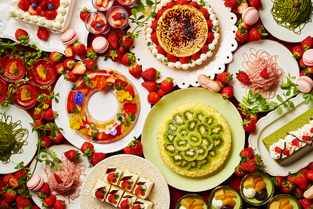 「苺のしぼりたてモンブラン」はもちろん、ふわふわのシブーストを乗せたタルトに苺をたっぷり使った「苺のシブーストタルト」。春らしい鮮やかな色彩は思わず写真を撮りたくなる「苺のリングゼリー」を始め、苺スイーツのラインナップはなんと11種類!甘酸っぱい風味が魅力の苺スイーツをずらりと並べて、甘い香りに満たされる春爛漫タイムをお楽しみください。