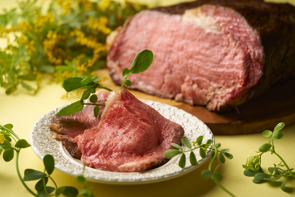 見どころのひとつは「国産牛ローストビーフ」。国産牛肉を低温でじっくり焼き上げ、肉汁たっぷりに仕上げたローストビーフを大胆に目の前で切り分けます。