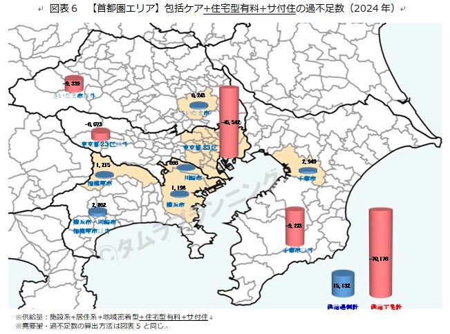 供給量に住宅型とサ付住を加えると、さいたま市に加え、千葉市、神奈川県全て(横浜市、川崎市、相模原市、横浜市・川崎市・相模原市以外の市町村)が供給過剰となり、供給過剰数の合計は1.5万人分に増加します。他方で、住宅型・サ付住を加えることで、首都圏エリアの供給不足数の合計は、7.0万人分(内、東京23区が4.5万人分)に半減します。