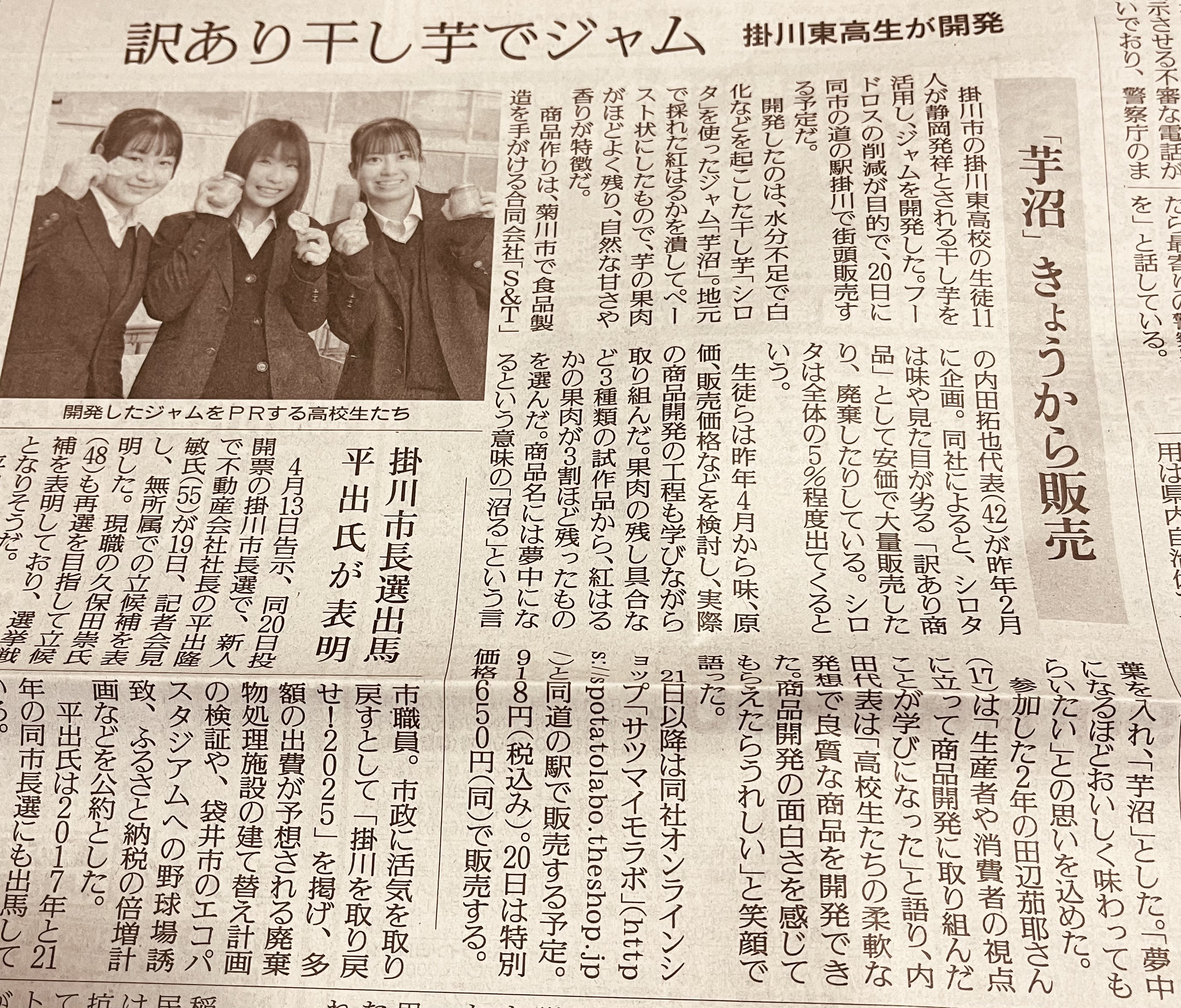 静岡県掛川市の道の駅掛川にて、掛川東高等学校(静岡県掛川市)の生徒と、菊川市のさつまいも加工販売事業者「サツマイモラボ」(合同会社S&T)が共同開発した干し芋ジャム『芋沼(いもぬま)』が、2025年3月20日に販売が開始されました。
