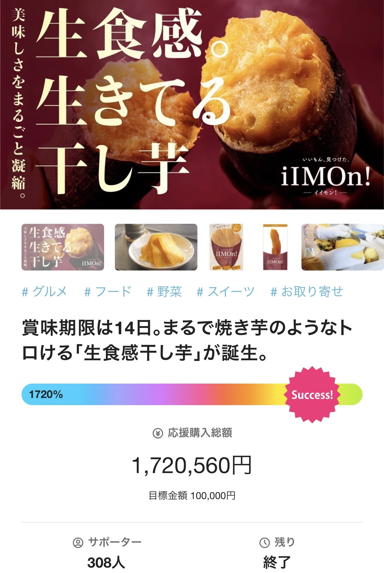 開発母体のチームは、別の干し芋商品で応援購入サービス「Makuake」にて目標比1700%超の支援獲得を達成した実績があります。