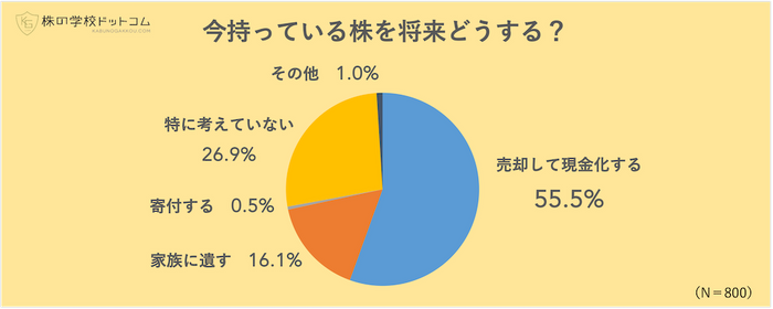 関連して、現在保有している株式について今後どうするつもりでいるかについても質問しました。「売却して現金化する」「家族に遺す」「寄付する」「特に考えていない」「その他」の中から選んでもらったところ、最も多かった回答は「売却して現金化する」で半数を超える55.5%でした。