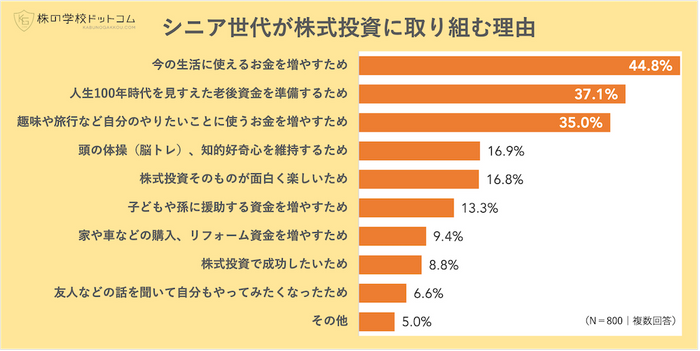 シニア世代の個人投資家に「株式投資に取り組む理由」について尋ねたところ(複数回答)、回答率が最も高かったのは「今の生活に使えるお金を増やすため」の44.8%でした。第2位は「人生100年時代を見すえた老後資金を準備するため」の37.1%、僅差での第3位は「趣味や旅行など自分のやりたいことに使うお金を増やすため」の35.0%でした。