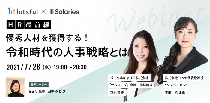 総合人材サービス、パーソルグループのパーソルイノベーション株式会社(本社:東京都港区、代表取締役社長:長井 利仁)が運営する副業人材マッチングサービス「lotsful(ロッツフル)」(https://lotsful.jp/)は、転職サービス「doda」などを提供するパーソルキャリア株式会社(本社:東京都千代田区、代表取締役社長:峯尾 太郎)が運営する「Salaries.jp※(以下、サラリーズ)」(https://salaries.jp/contents/lp)と共催で、2021年7月28日(水)19:00から「HR最前線ー 優秀人材を獲得する!令和時代の人事戦略とは」をテーマにオンラインセミナーを開催します。※「Salaries.jp」として商標申請中