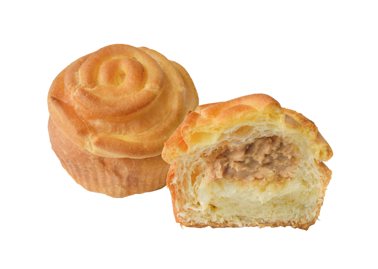 ヘーゼルナッツ味のクリーム入りのデニッシュにシュー生地をしぼって焼き上げました。