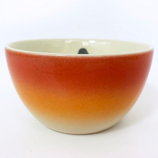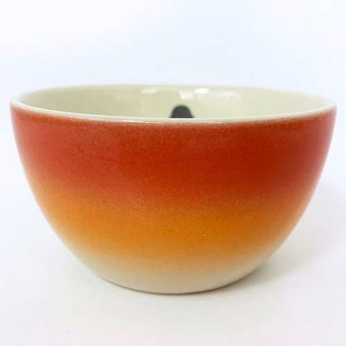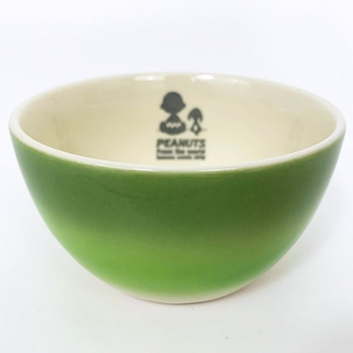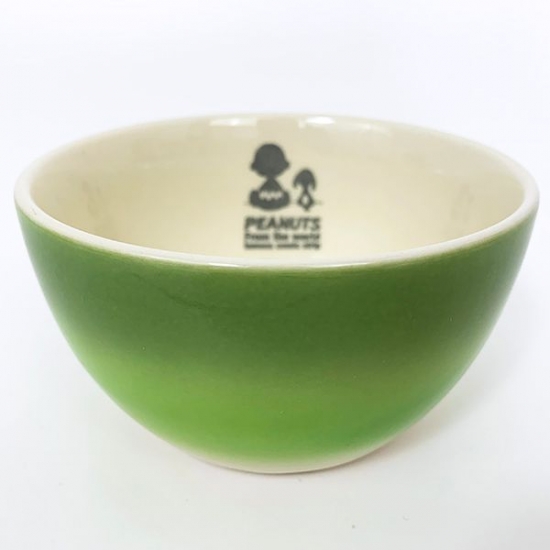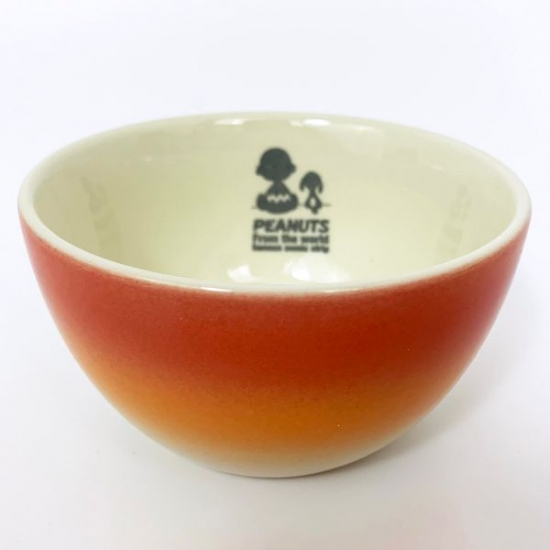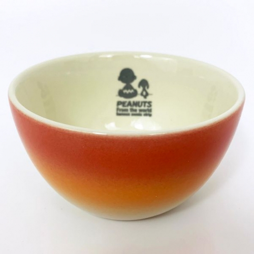 まずは、夕焼けのようなオレンジ色のグラデーションが美しいボウルをご紹介。アイボリーのボウルで、外側がグラデーション、内側にチャーリーブラウンとスヌーピーの後ろ姿のシルエットがデザインされています!