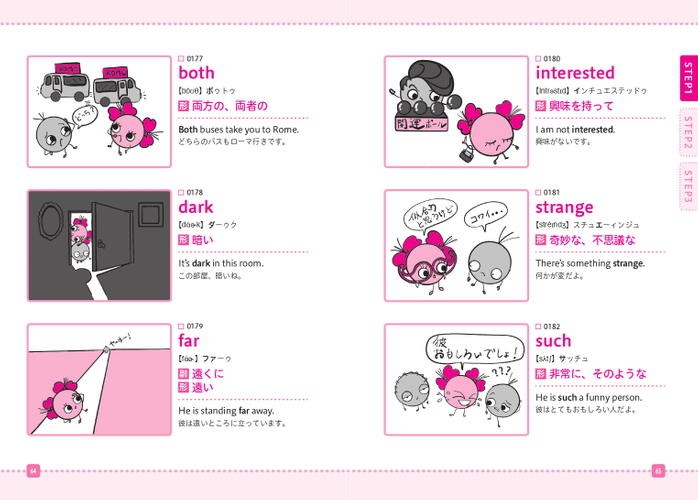 すべての単語に1コマ漫画が描きおろされていて、クスっと笑いながら英単語を学べる1冊です。