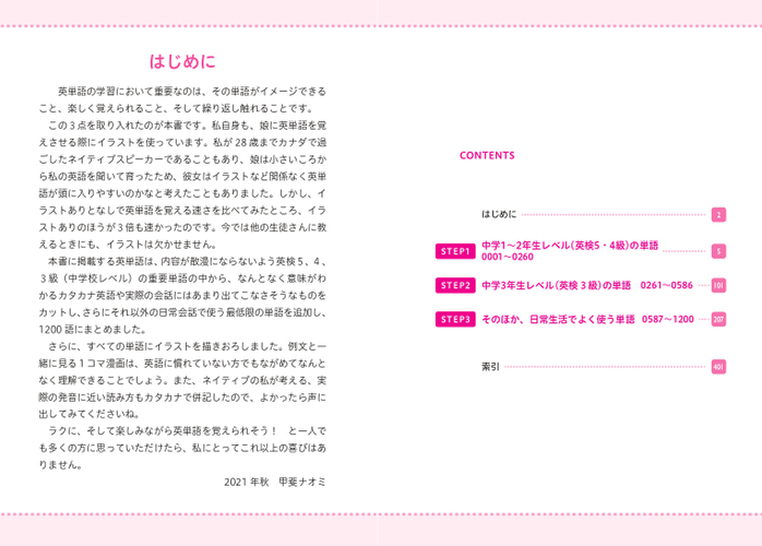 本書に掲載する英単語は、内容が散漫にならないよう英検5、4、3級(中学校レベル)の重要単語の中から、なんとなく意味がわかるカタカナ英語や実際の会話にはあまり出てこなさそうなものをカットし、さらにそれ以外の日常会話で使う最低限の単語を追加し、1200 語にまとめました。