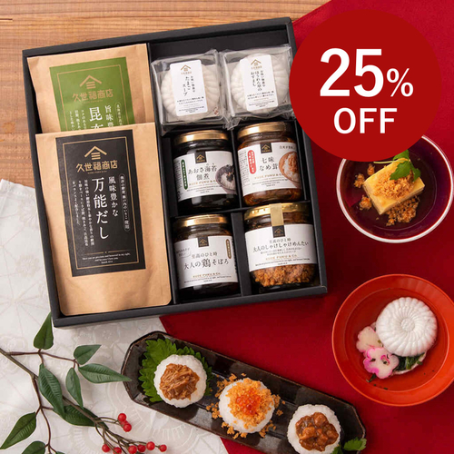 久世福で大人気の2種のおだしと、見た目も華やかな「お吸い物最中」、そしてごはんのお供4品の、合計8品! 和食の魅力が詰まったギフトセット です!