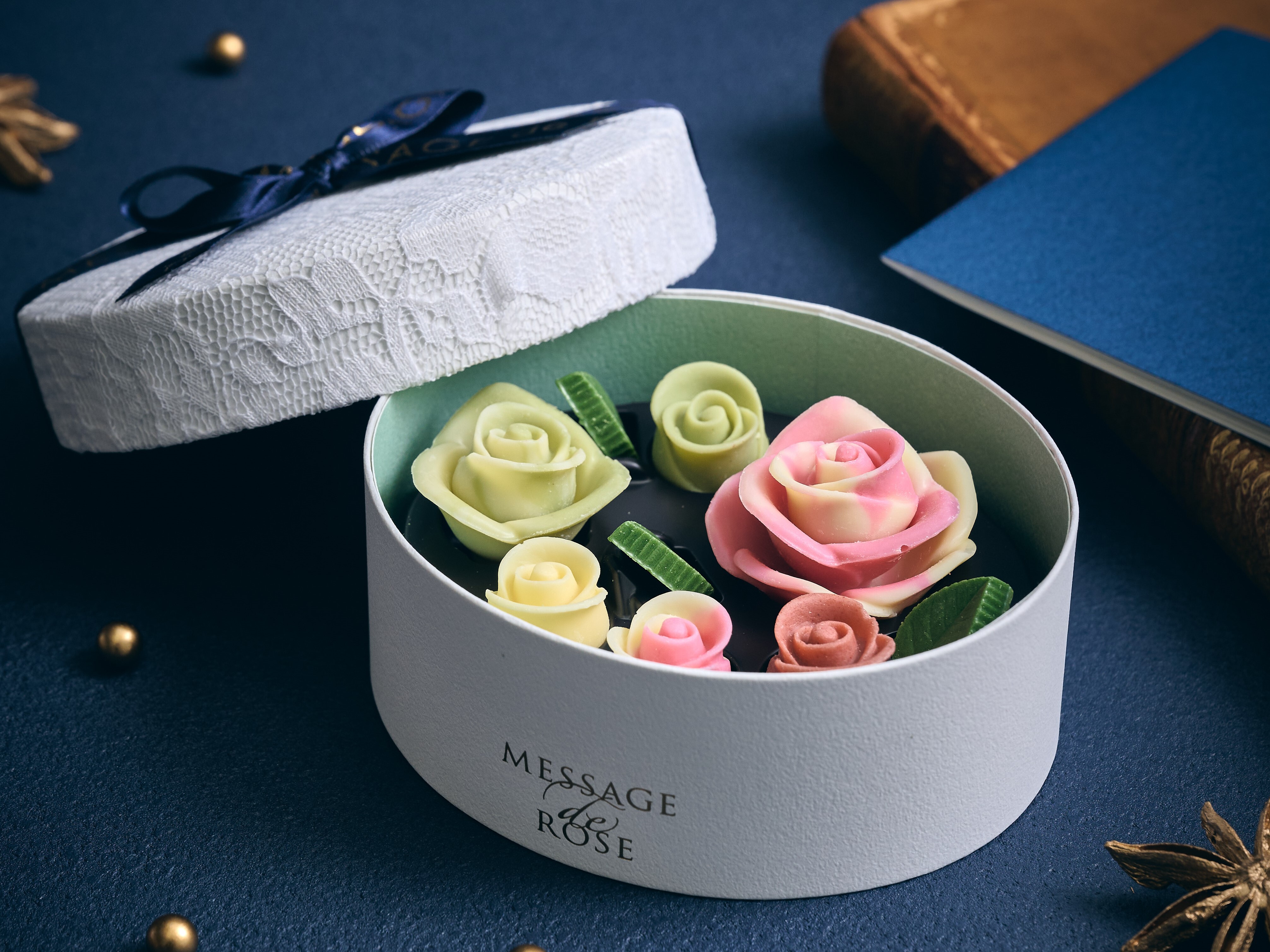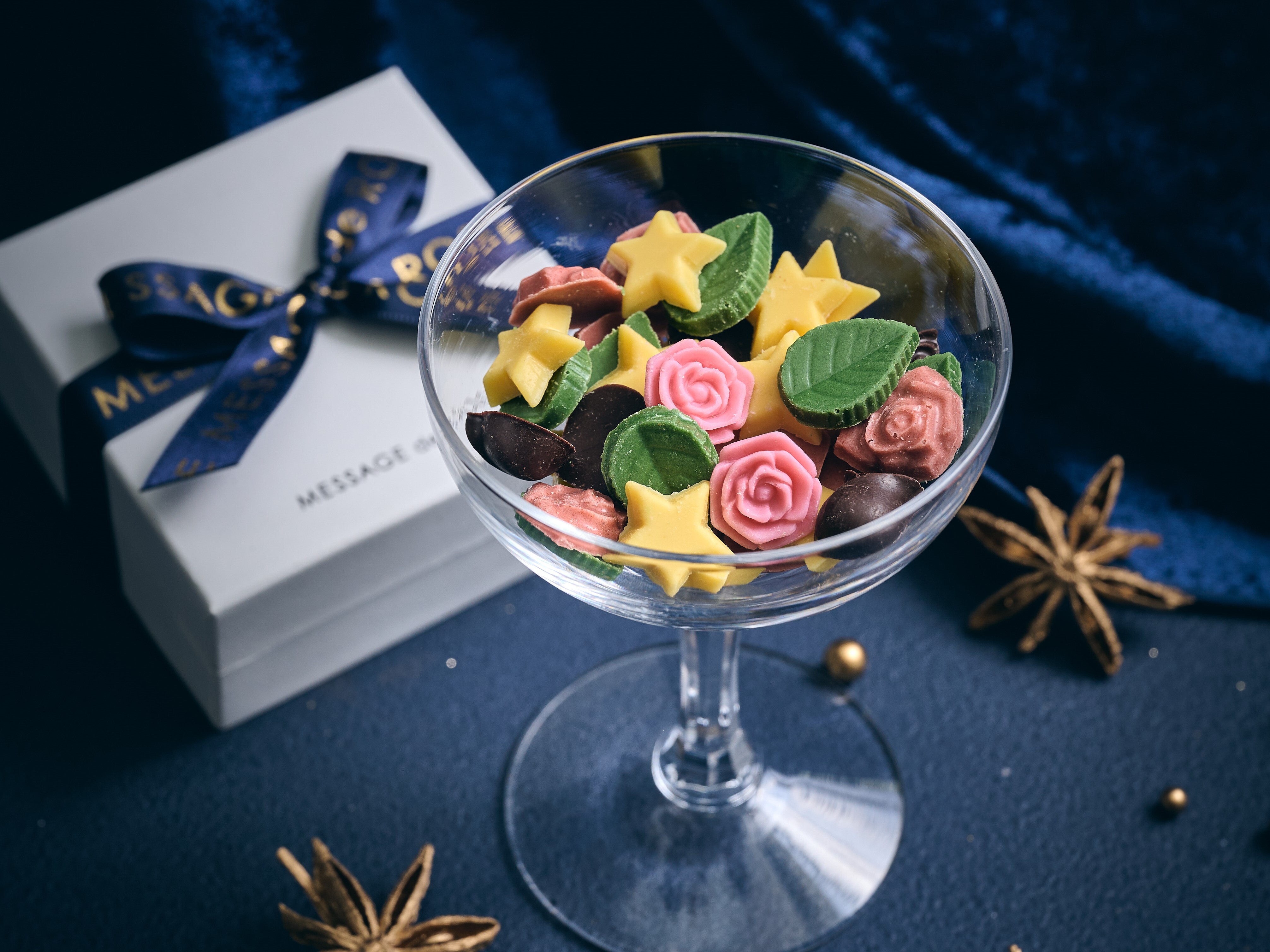 小さな薔薇のつぼみとリーフを並べ、華やかで幸せな色合いのブーケをデザインしました。薔薇のつぼみは、イチゴ、ピーチ、ピーチマーブル、ホワイト、ピスタチオ、ピスタチオマーブルの全6種をカラフルに配置し、周囲には抹茶のリーフをあしらっています。一度に7つのフレーバーが楽しめるのは、クリスマスコレクションならではの魅力です。蓋を開けると、カラフルな薔薇が冬の夜空に咲き誇るかのようなゴージャスな装いで、クリスマスの贈り物に最適なギフトとなっています。